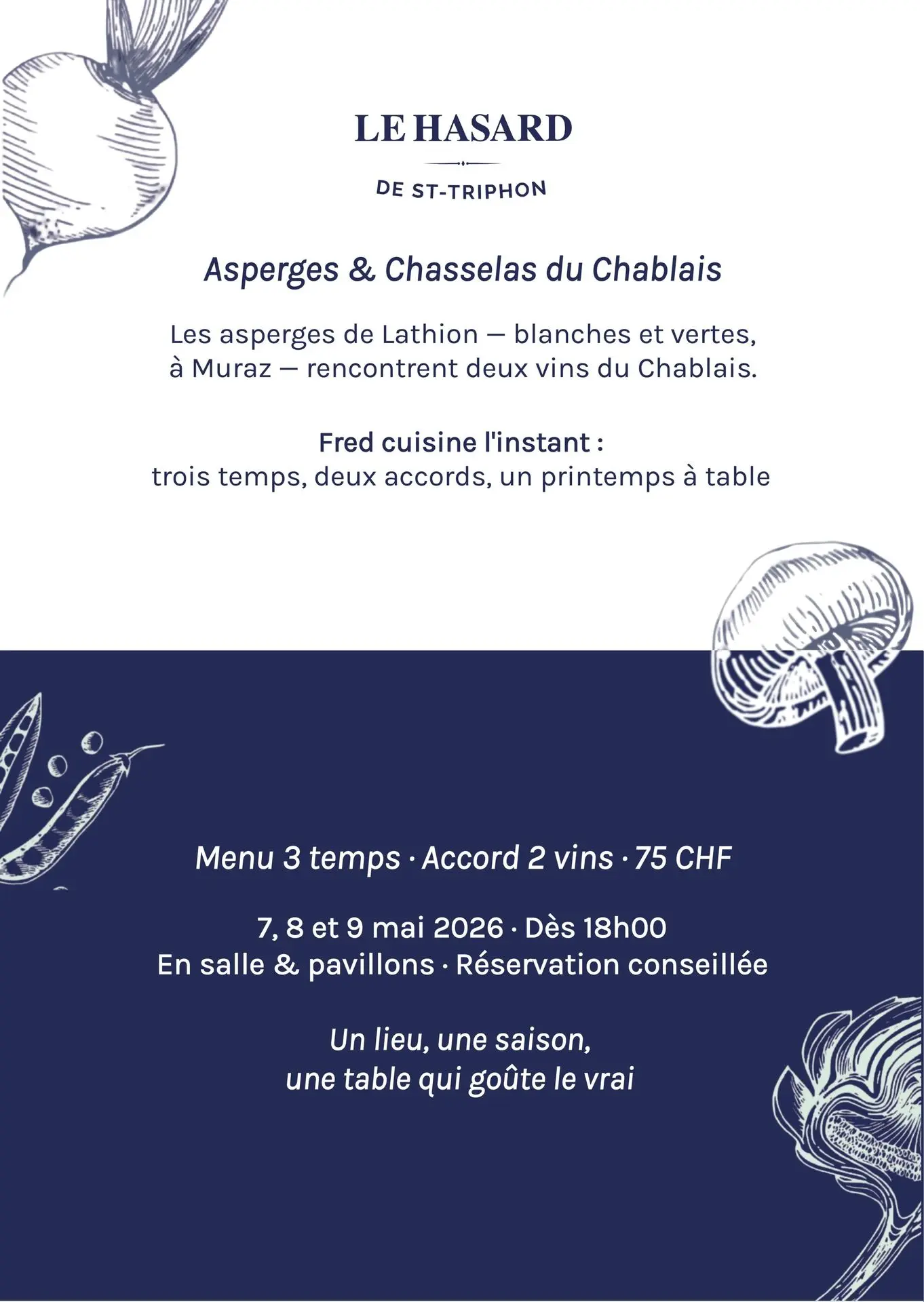 Un menu en trois temps pensé autour de l'asperge : agrumes, fleurs de romarin, sérac, agneau, fromage de brebis, ail des ours. Deux vins du Chablais pour l'accompagner — le Chasselas de Borter d'Ollon, vif et minéral, et l'Amigne des Fils Maye de Vétroz, pour la complexité et la douceur aromatique.